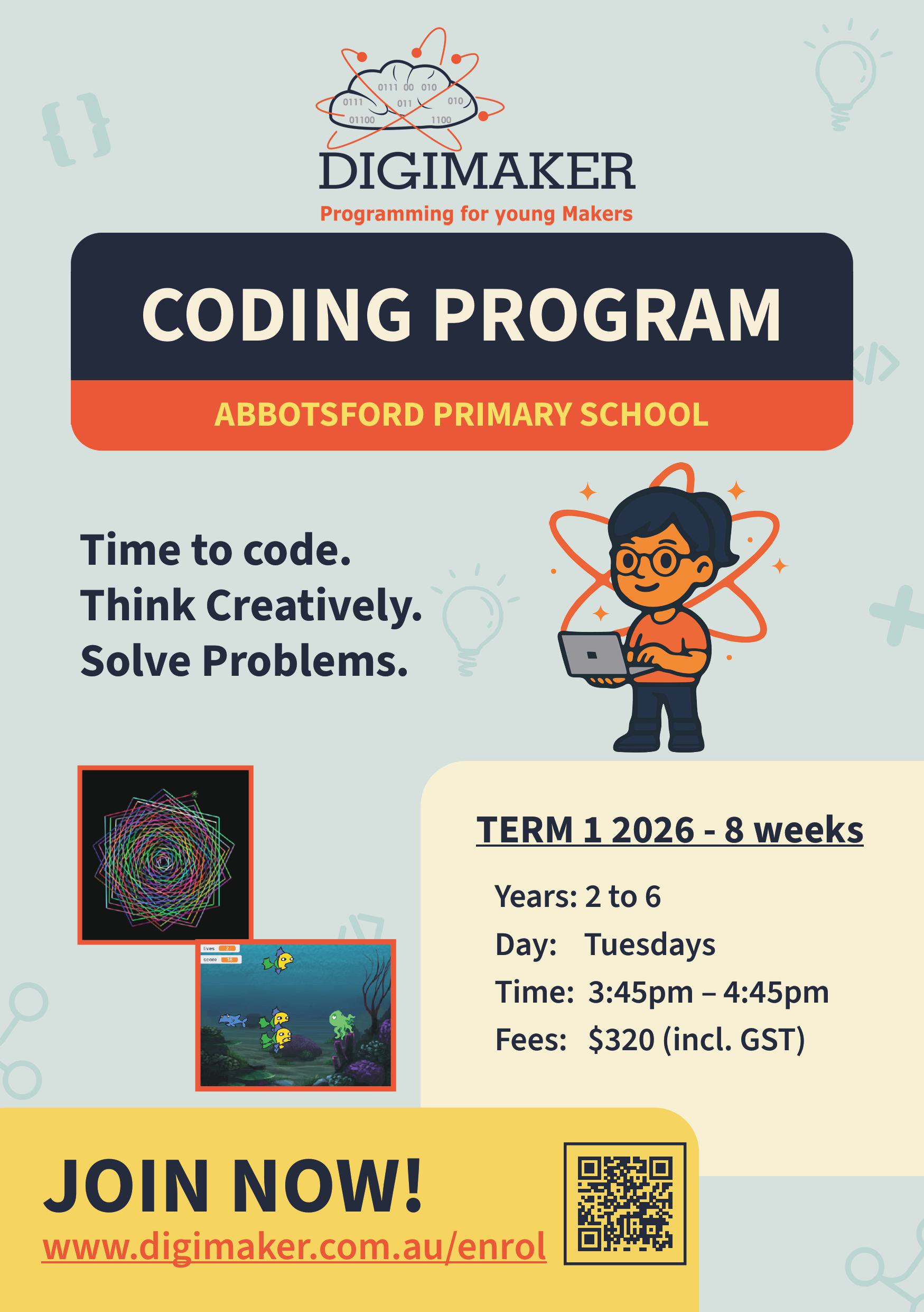 Coding / Computer Programming Abbotsford Primary School will continue to offer coding as part of its' after school clinics offering in 2026. These coding sessions will be run by Digimaker.